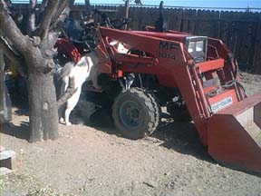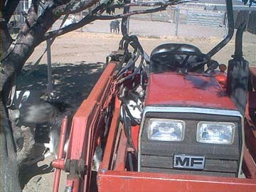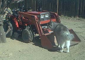 I've always known that Holly was mechanically inclined. After all, any dog who unlocks dishwashers, opens locked doors, and spends time seriously thinking about a project before going ahead with it is obviously a mechanic at heart. On the 4th of July I was heading out front to watch our local parade (in which the neighbor kids were participating) when I realized I hadn't seen Holly or her Jindo buddy Kiva for a while. Silence and absence always make me wonder what Holly is up to now, so I went looking. Despite the heat, it soon became obvious that Holly was not inside the house hanging out in the AC. Truthfully not that unusual for Holly, she's a true California girl who likes to get in her sunbathing time. I figured she would be laying out in the yard. A quick look yielded no dogs however. My first sign that Holly was up to something came in the form of several pieces of metal being carried around by Kwest. For the life of me I couldn't figure out where he got them. I don't make a habit of leaving such things lying around the yard. It took a bit of searching, but I soon realized that there were nuts, bolts, and pieces of various hoses lying around the tractor in the yard. Since the tractor had been intact the evening before I took a good guess that I'd found my dog. Sure enough, around the other side I found Holly underneath the tractor, surrounded by bits and pieces of hose, and very intent on the engine. Since I'd been heading out to the parade I happened to have my camera in my pocket, so yes I did get a couple pictures of Holly and her assistant Kiva doing their best to dismantle my dad's tractor. The big surprise came when I then approached them and asked what on earth they thought they were doing. All of a sudden I realized that the tractor was making a "chuck chuck chuck" noise. All I could think of was "oh my goodness - she's hotwired the tractor". I shuffled all the dogs away just on the basic principle that tractors should not go "chuck chuck" and who knows what might happen next. Holly was not happyafter all she had spent considerable time working on this project and here I was disrupting her work. I'm not totally sure what she wanted the tractor for. Perhaps she was planning on joining the 4th of July parade? Better yet, I'm betting she had heard me say at the weight pull the day before that we were coming back to pull again on the 5th. Knowing Holly, she was plotting to take the tractor down to the weight pull so that she wouldn't have to do all the work. Instead she had to pull that WWPDX leg all by herself on Saturday without the benefit of any help from a tractor (yeah, Holly went back and pulled an X-leg on Saturday - I'm still in total shock that she would do any such thing but she sure was having fun). But trust Holly to try to find an easy way out :-) I've suggested to Dad on many occations that he might want to park his tractor in a location where the dogs can not reach it. He has insisted that there is no way the dogs can dammage it. He said the same about his boat trailer, and then had to chase down the whole wiring system while Kwest was having a ball draging it around the yard at full speed (he was a pup at the time, though I've always suspected that Holly was the culprit who pulled the plugs and actually removed the wires). Maybe this time Dad will listen to me. Holly hopes he doesn't, after all he leaves such interesting stuff for her to play with. |